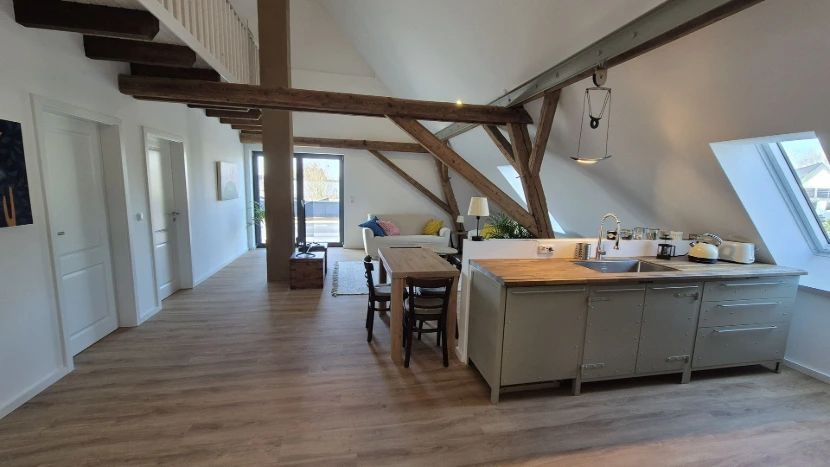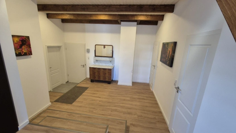 Blick auf die Rückseite der Küche, zum Flur und ins Obergeschoss