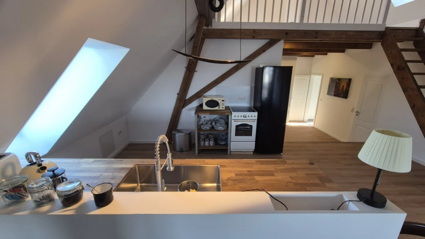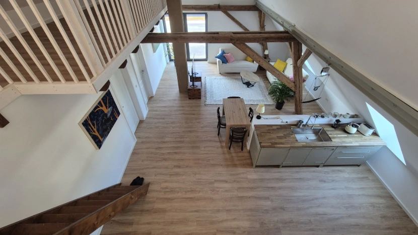 Blick aus dem Oberschoss nach unten, hinterer Teil: Sofas und TV, vorderer Teil: Küche